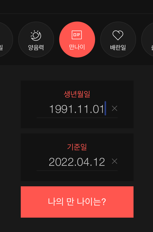 생년월일과 기준일을 입력하고 < 나의 만 나이는?>을 클릭하면 만 나이를 볼 수 있습니다.