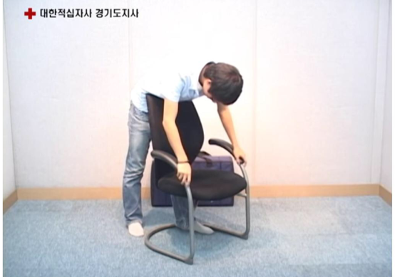 책상이나 의자를 잡고 자신의 명치와 배꼽사이를 대고 강하게 주저앉아 압박을 주는 것입니다.