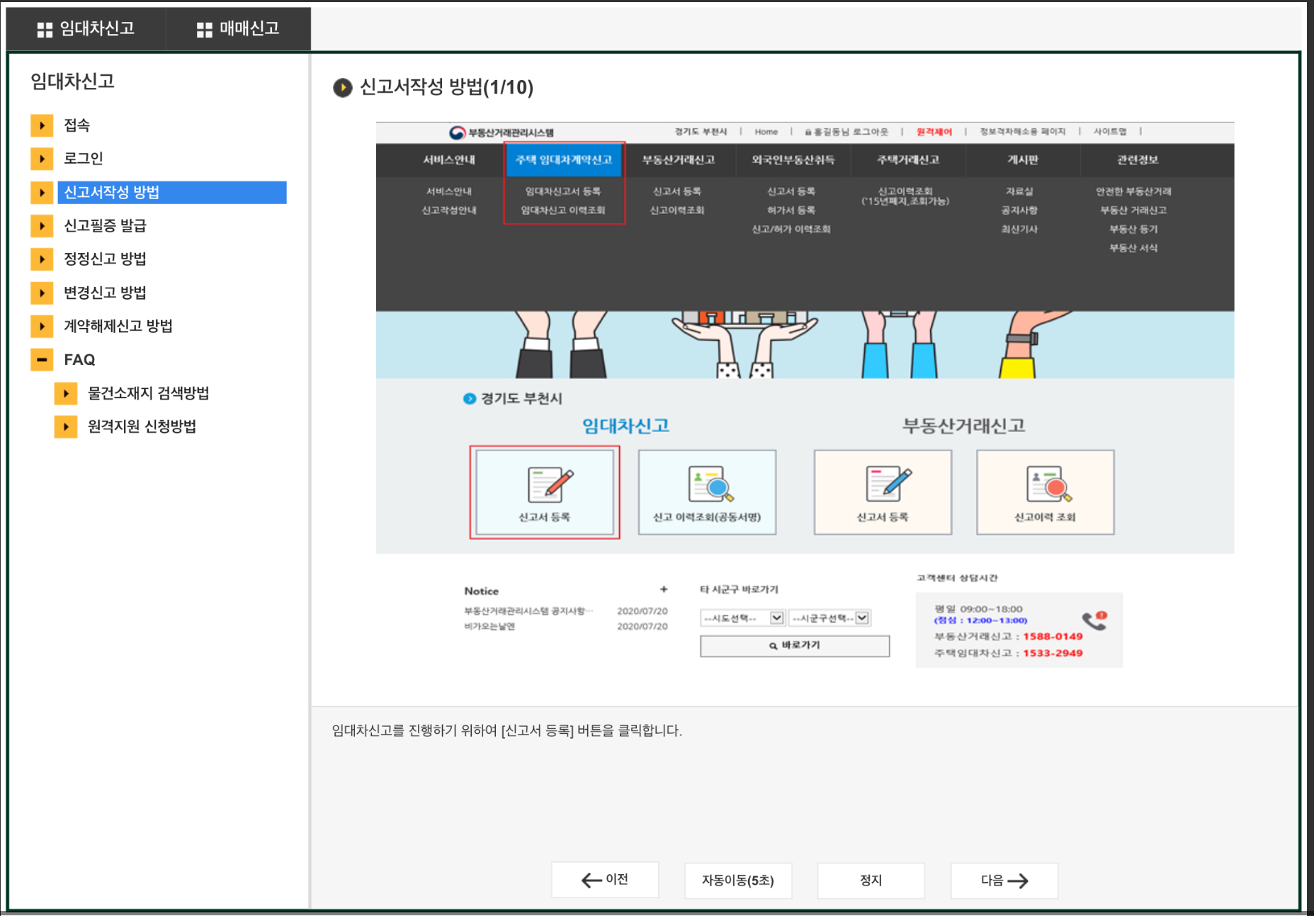 접속 > 로그인 > 신고서작성 방법 > 신고필증 발급 > 정정신고 방법 > 변경신고 방법 > 계약해지신고 방법 > FAQ > 월간소재지 검색방법 > 원격지원 신청방법